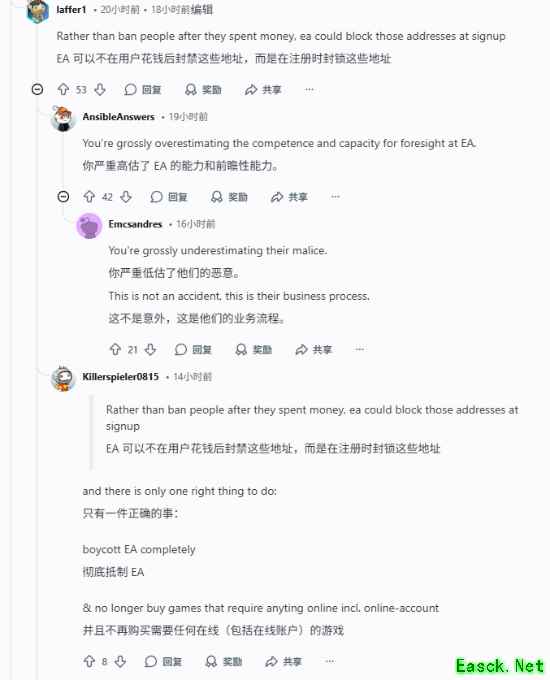 评论区玩家热心指出问题,也有玩家一起怒骂EA,并呼吁大家一起抵制EA产品。
