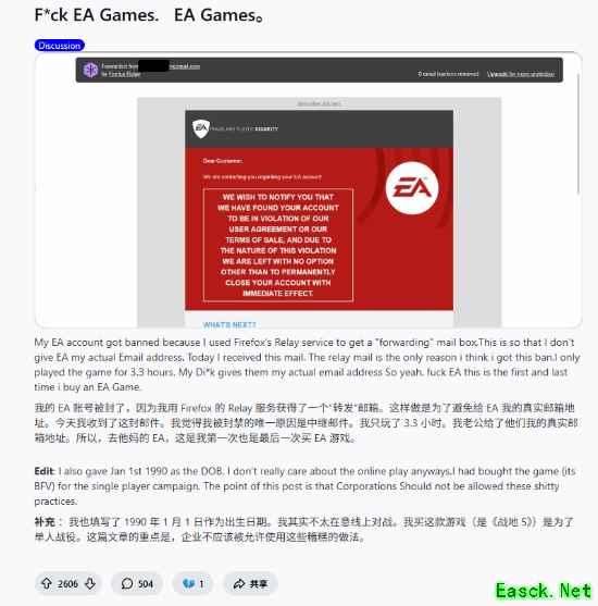 近日,外网一位玩家在论坛发帖怒骂EA,称自己只是因为不想给EA自己的真实邮箱地址而用了中继邮箱,就导致自己的EA账号被封,这将是自己第一次也是最后一次买EA的游戏。