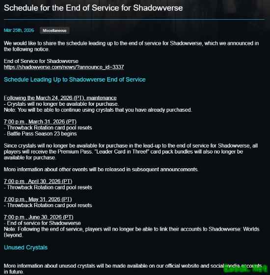 2026年3月25日消息,运营十年的全球知名在线卡牌游戏《影之诗》(Shadowverse) 官方今日正式发布了令人心碎的停运详细时间表。