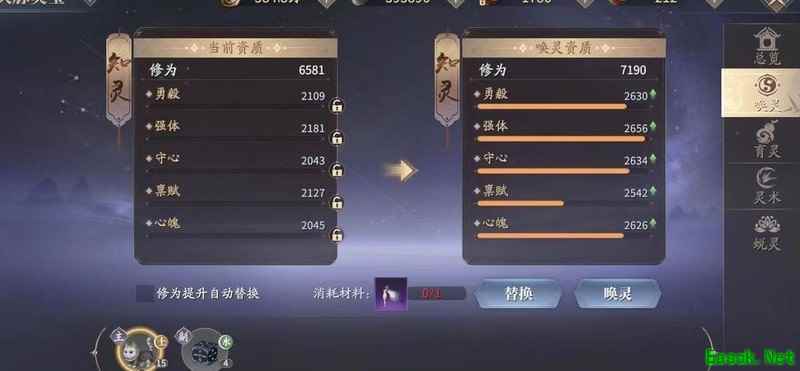 建议暂时保留唤灵材料,先不要急于提升。因唤灵资质初始为白品,数值在2000至2200之间,成长空间有限。应优先提升育灵等级,待其突破后资质上限提高,再进行唤灵洗练,效果更佳。