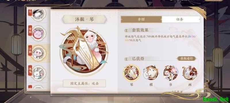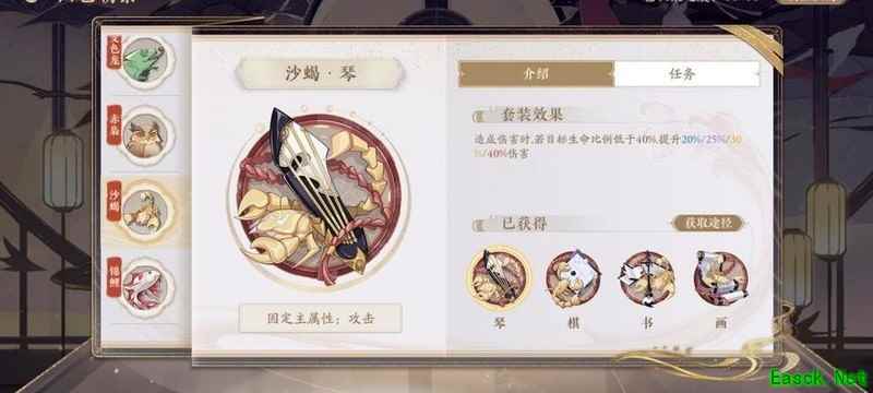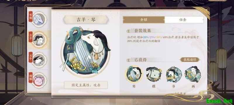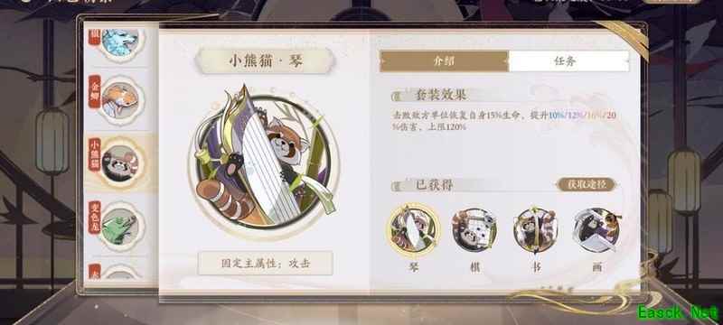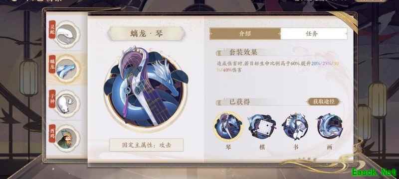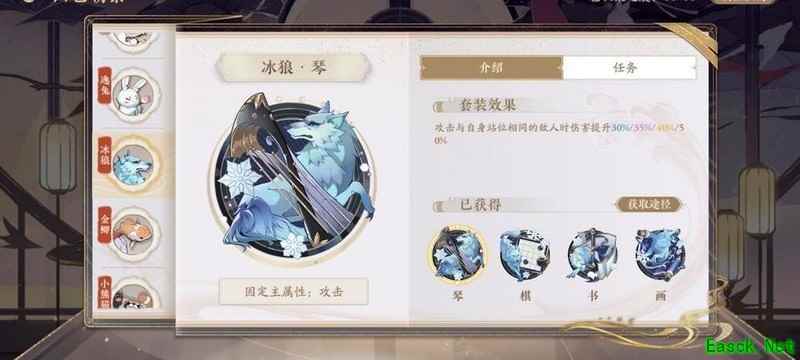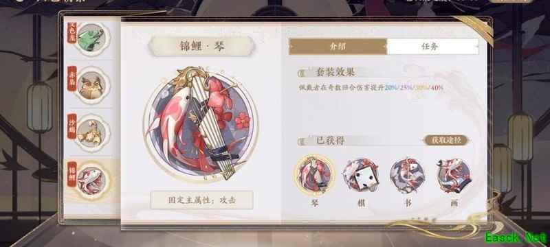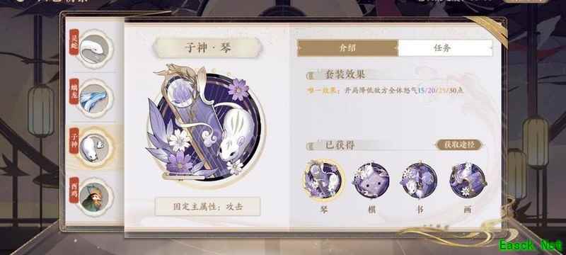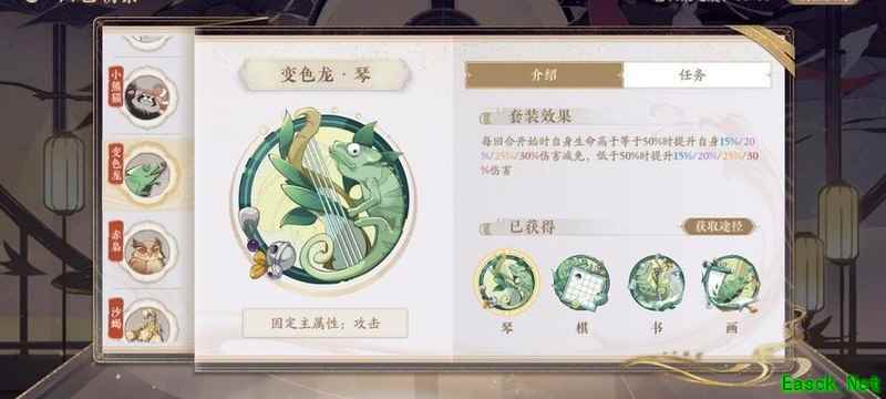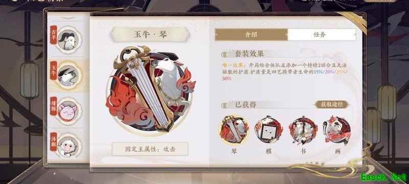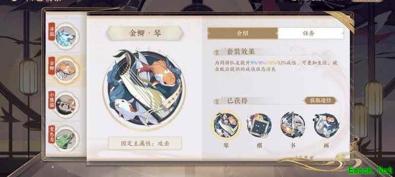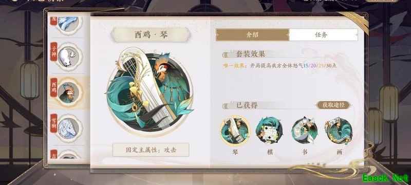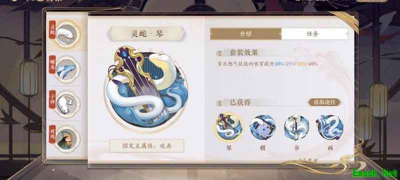 四艺分为蓝、紫、橙、红四种品质,品质越高效果越强。其位置为琴、棋、书、画,主属性分别对应攻击、生命、防御和先手,副属性随机生成且可重复。每提升两级,便会强化一个副属性。
