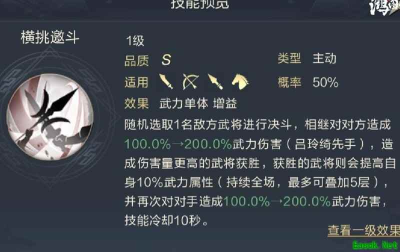 吕玲绮拥有与单个敌人决斗的技能,可先后发动两次武力攻击,依据造成的伤害值高低,获得相应武力提升及附加伤害效果。