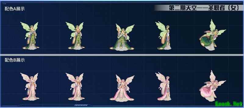 这套女圣职的天空装扮可谓本期中最引人注目的设计,大胆融合了精灵、仙灵与奇幻元素,整体造型宛如高贵的精灵仙子或异世界中的灵幻角色。配色分为金绿与黄粉两种风格。若不搭配翅膀,它便是一袭华丽典雅的高级礼服,设计精致、细节考究,展现出极高的时装艺术水准。