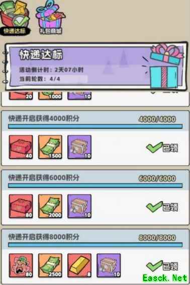 在参与快递类达标活动时,可以选择开启神话快递,因为这类快递在活动中不计入积分。普通快递积分为1,稀有快递为10,史诗快递为20,传说快递为50,而神话快递无积分。整个活动完成一轮需累计8000积分,但实际上只需收集约3300积分的箱子即可完成,因为开箱所得积分可兑换更多箱子,最终累计达到8000分。每完成一轮可获得80个关羽碎片,总共可完成四轮。