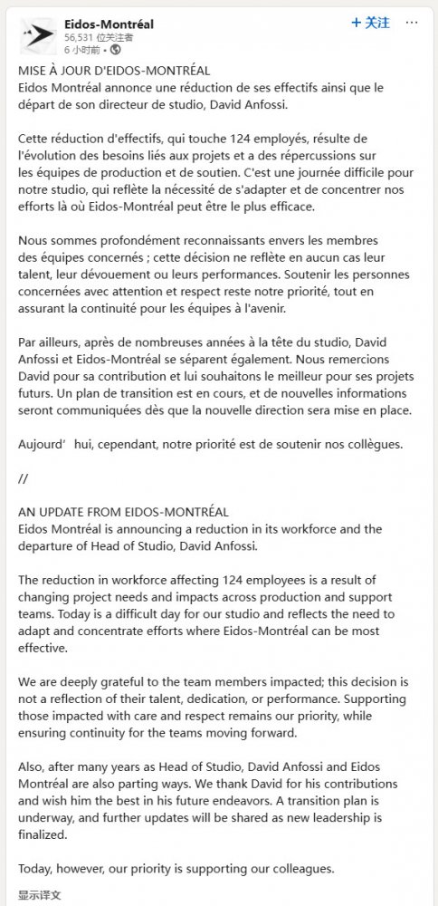 Eidos蒙特利尔刚刚宣布将裁减工作室124个工作岗位,同时,在该工作室工作了十多年的负责人David Anfossi也将离职。