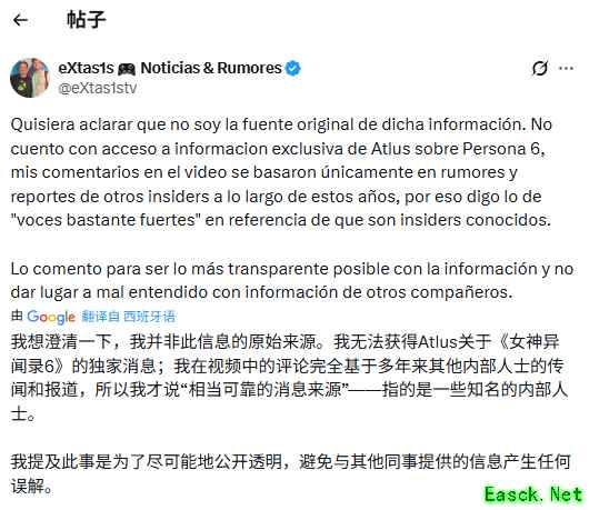 随后,Extas1s发布声明澄清,自己并非该信息的原始来源,也无法获取Atlus关于《女神异闻录6》的独家信息。他解释称,视频中的评论仅基于多年来其他内部人士的传闻和报道,所谓的“相当强烈的信号”指的正是那些知名内部人士的说法。他表示,此举是为了尽可能保持信息透明度,避免对同行提供的消息产生误解。