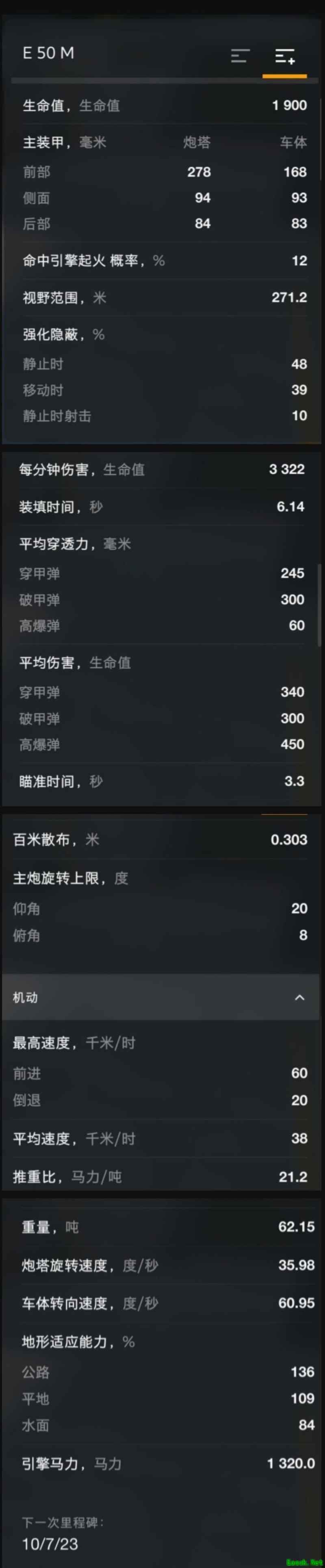 是不是感觉这个造型很眼熟?浓浓的德国风格扑面而来。先不看参数,只要看到这样的车身设计,老玩家立刻就会联想到硬这个字。作为全游戏中最硬的中型坦克,E50 M在中坦线上表现抢眼。其车体正面装甲达到168毫米,且角度极大,使得在正面对线时几乎不会被击穿。侧甲和后甲不仅有效防止高爆弹的威胁,也足够支撑在战斗中侧身卖头。