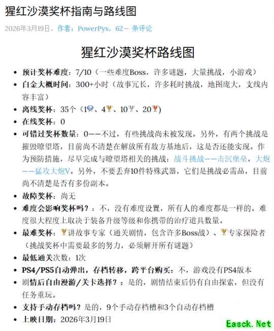 据长期专注于PlayStation奖杯攻略的网站PowerPyx估算,开放世界游戏《红色沙漠》的白金奖杯完成时间预计超过300小时。尽管游戏发售仅12天,已有少量玩家达成了这一“严苛”成就。