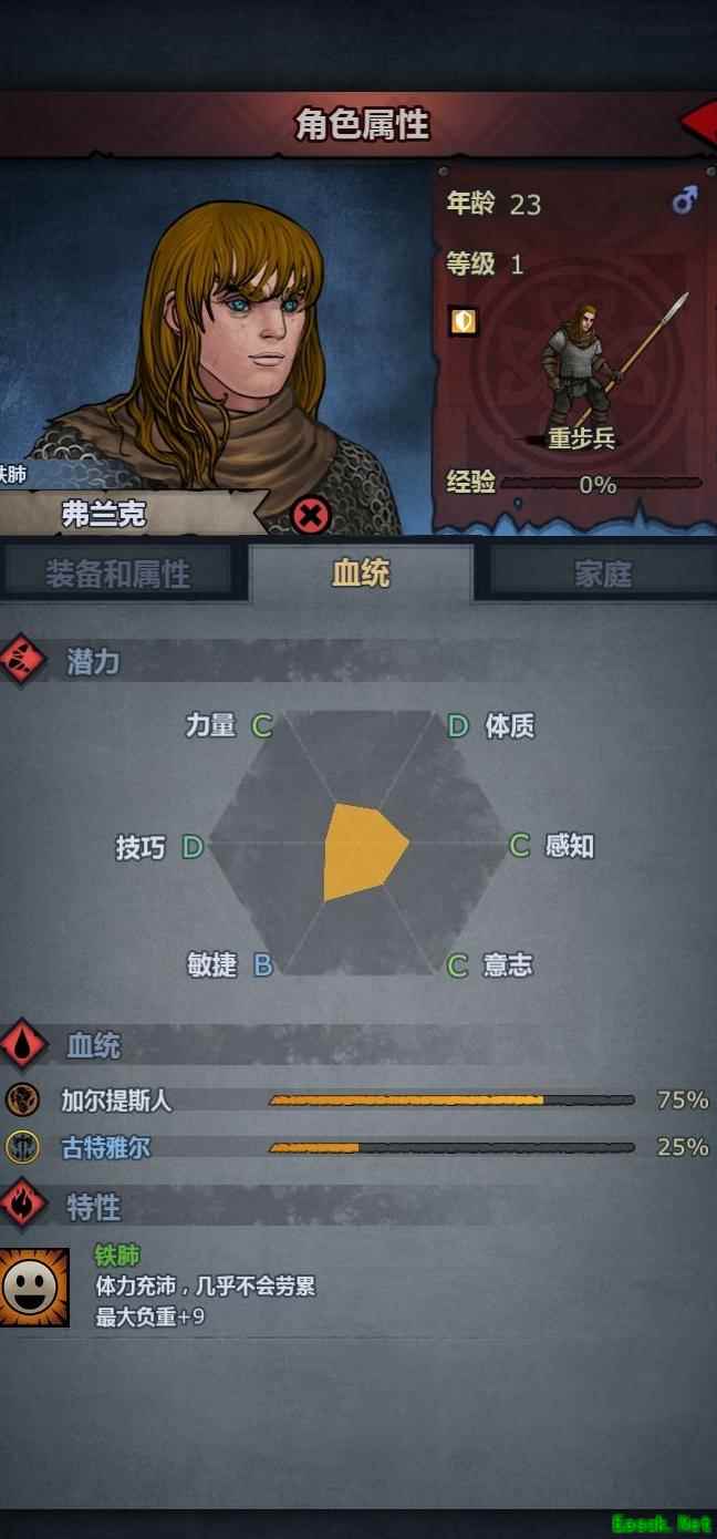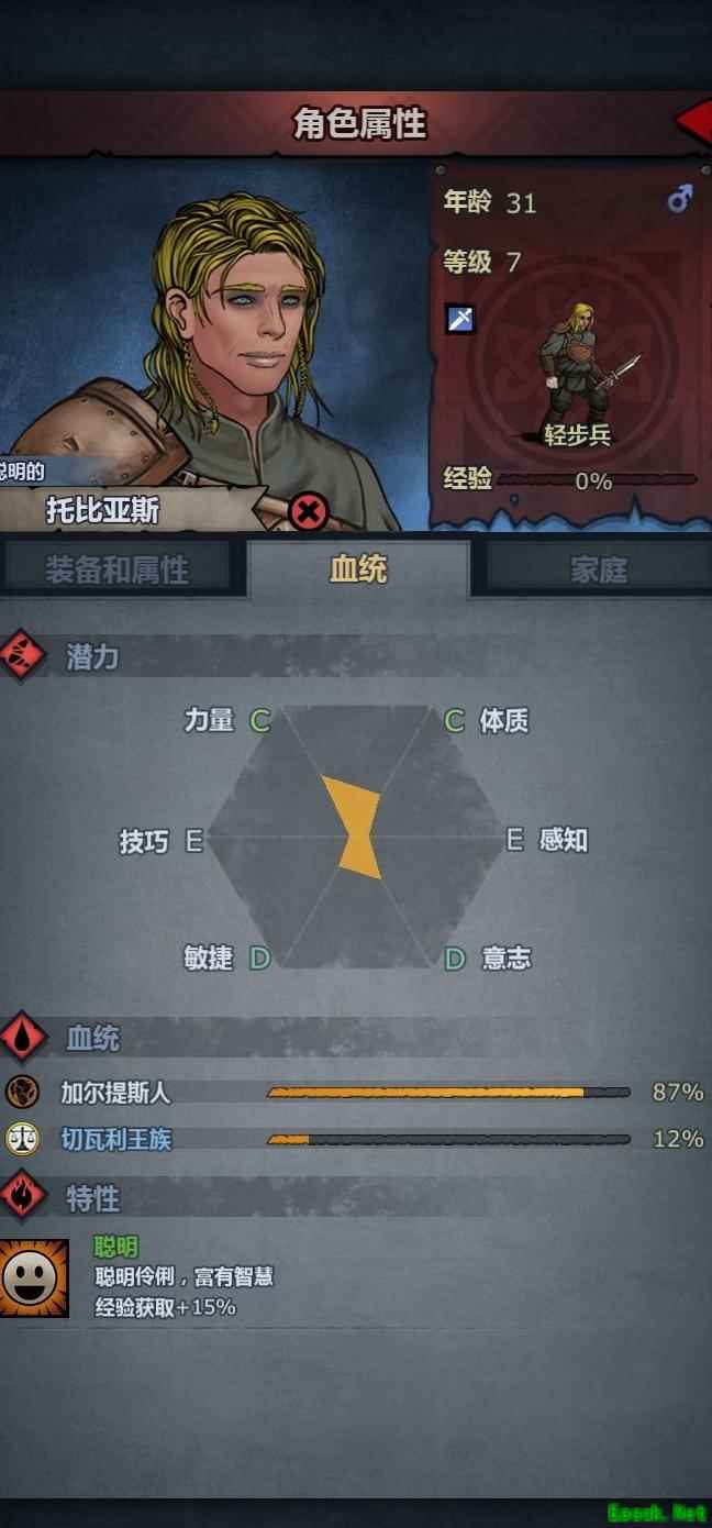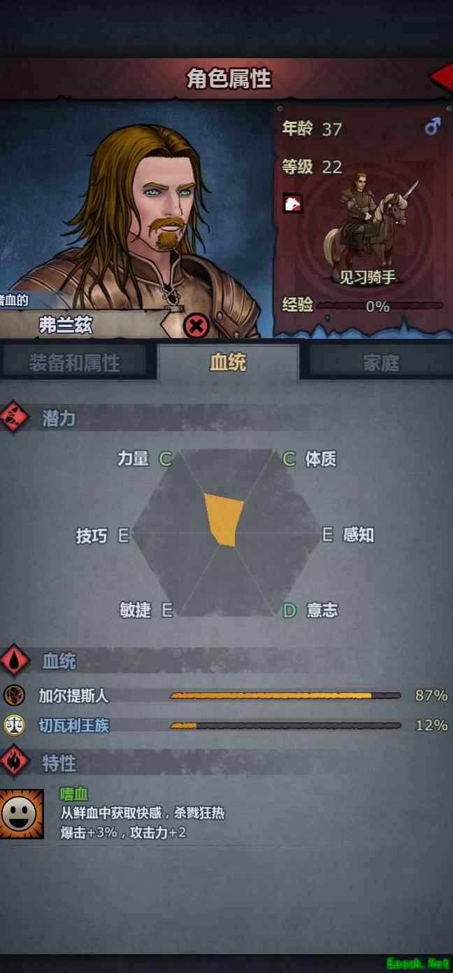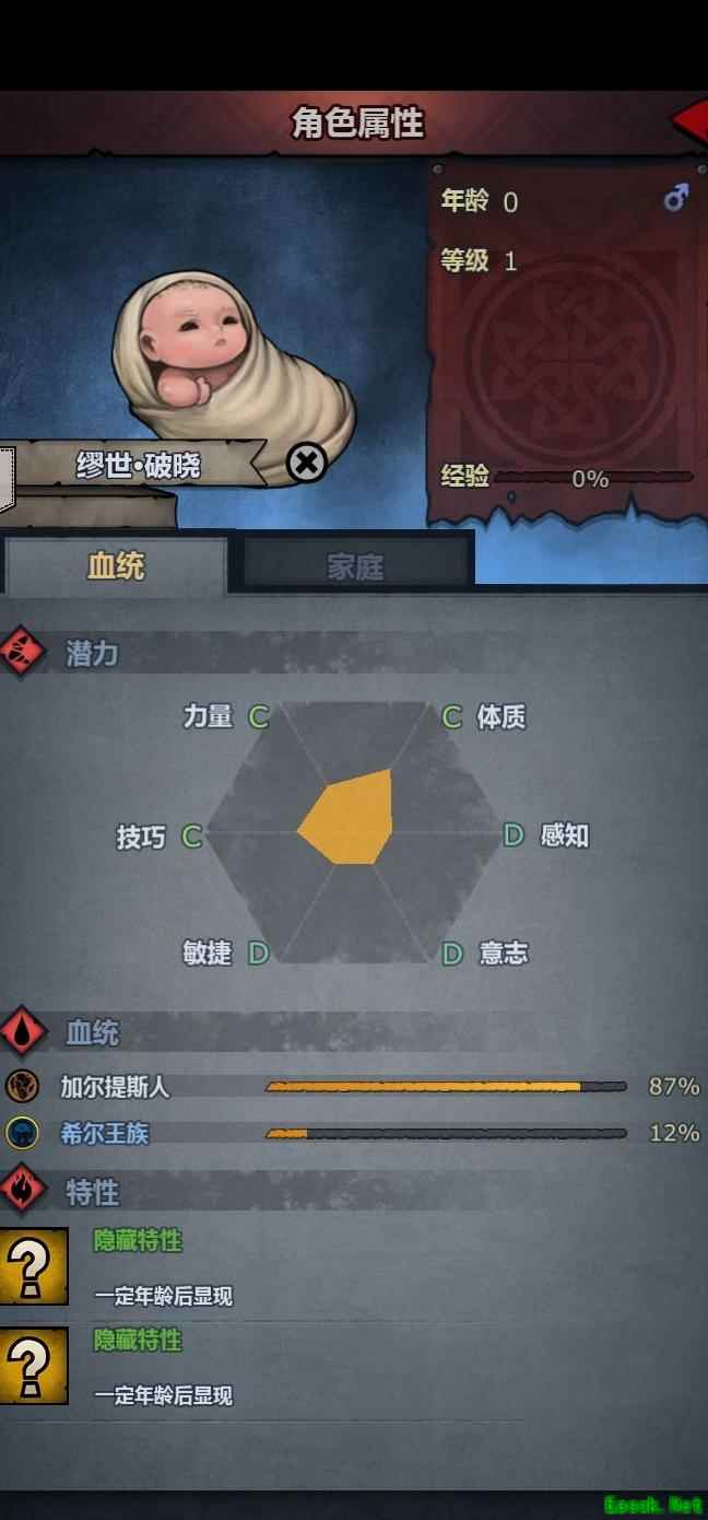 长子出生,资质平平,但继承了骑士爵位与十二分之一的希尔王族血脉,尽管双亲皆为骑士,次子未必能获同等传承。