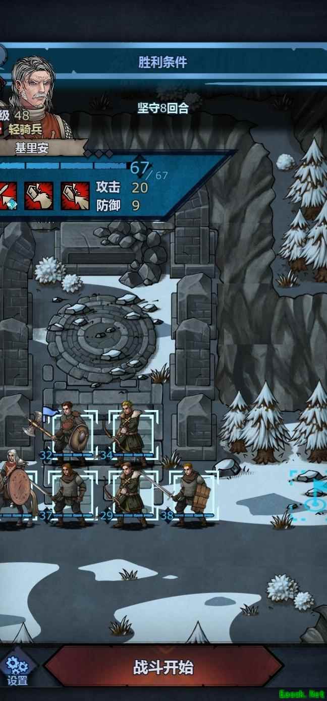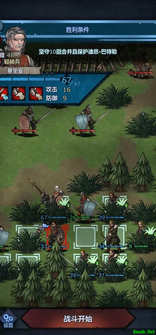 将弓箭手与老骑士基里安按指定位置摆放,其余人员可灵活调整站位。战斗开始后,基里安优先出手,直接突进攻击目标人物——即图中身穿农民服饰的特殊角色。弓箭手作为补刀手段,以防基里安未能一击毙敌。其余队员需注意站位,避免误伤。此阶段仅靠荒塔村几人配合两个盾牌任务,完成难度依然较高。