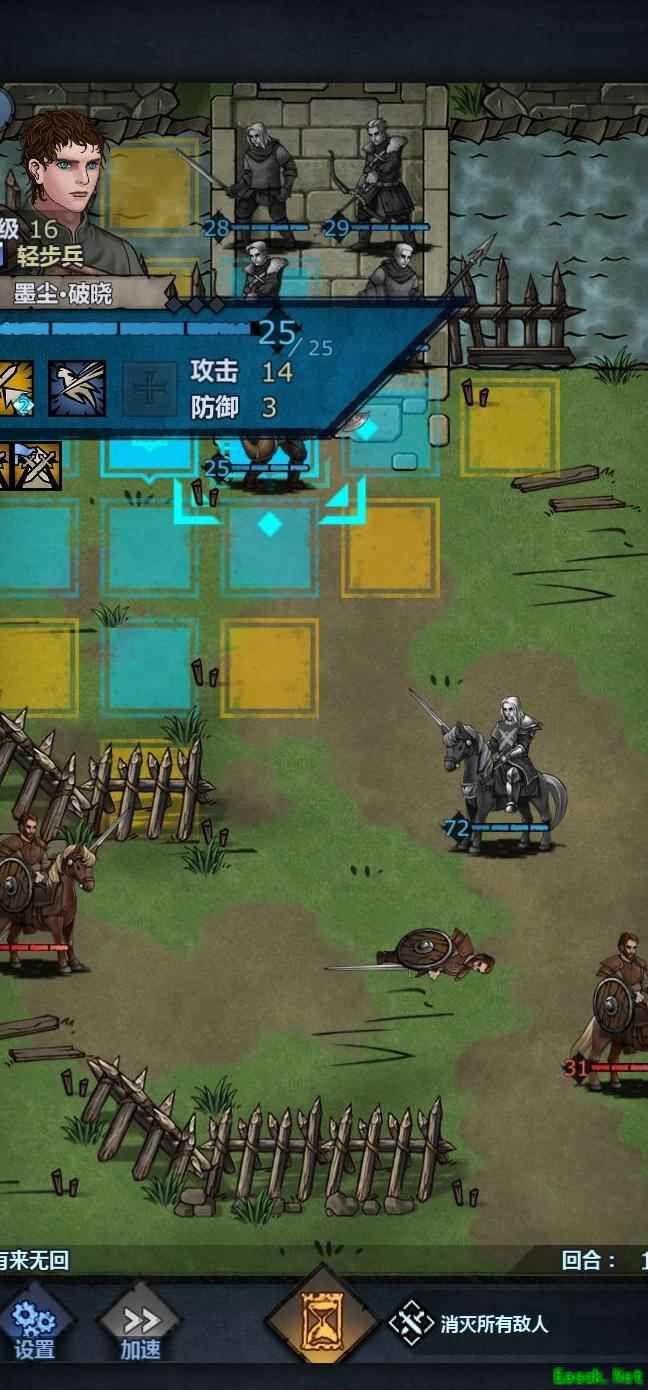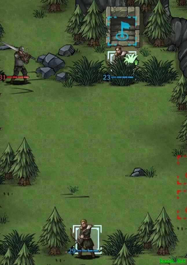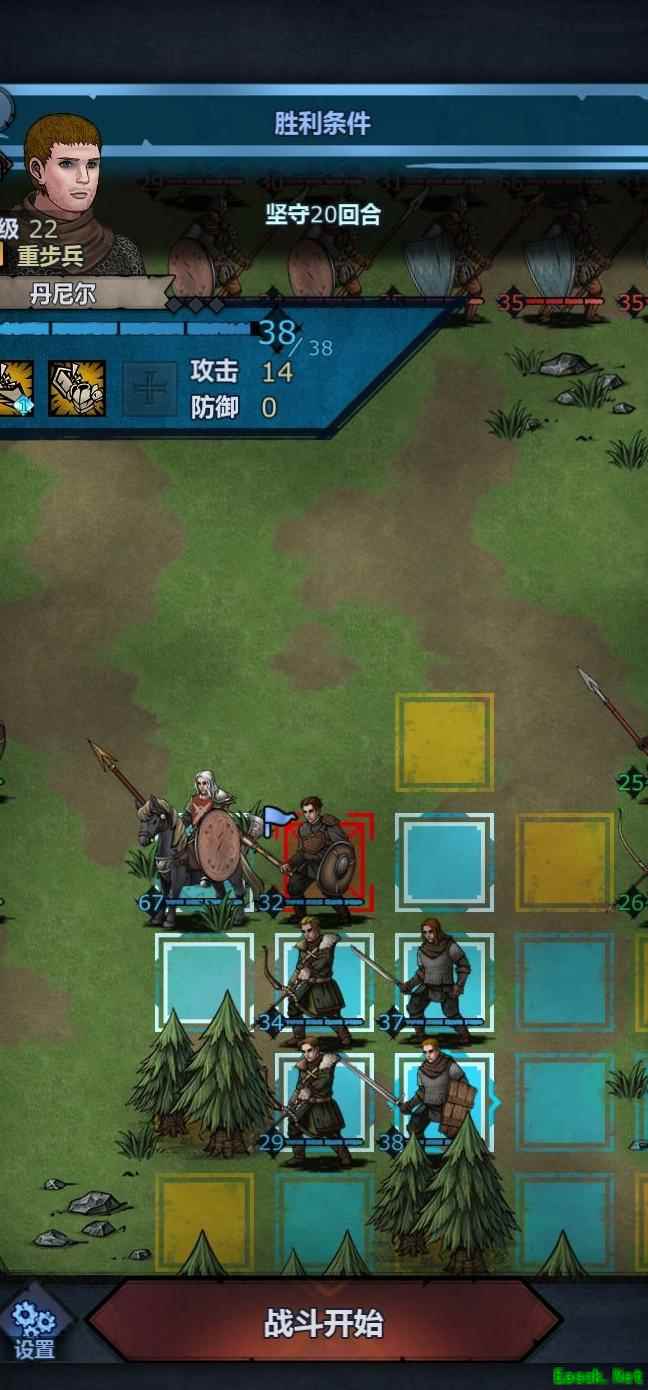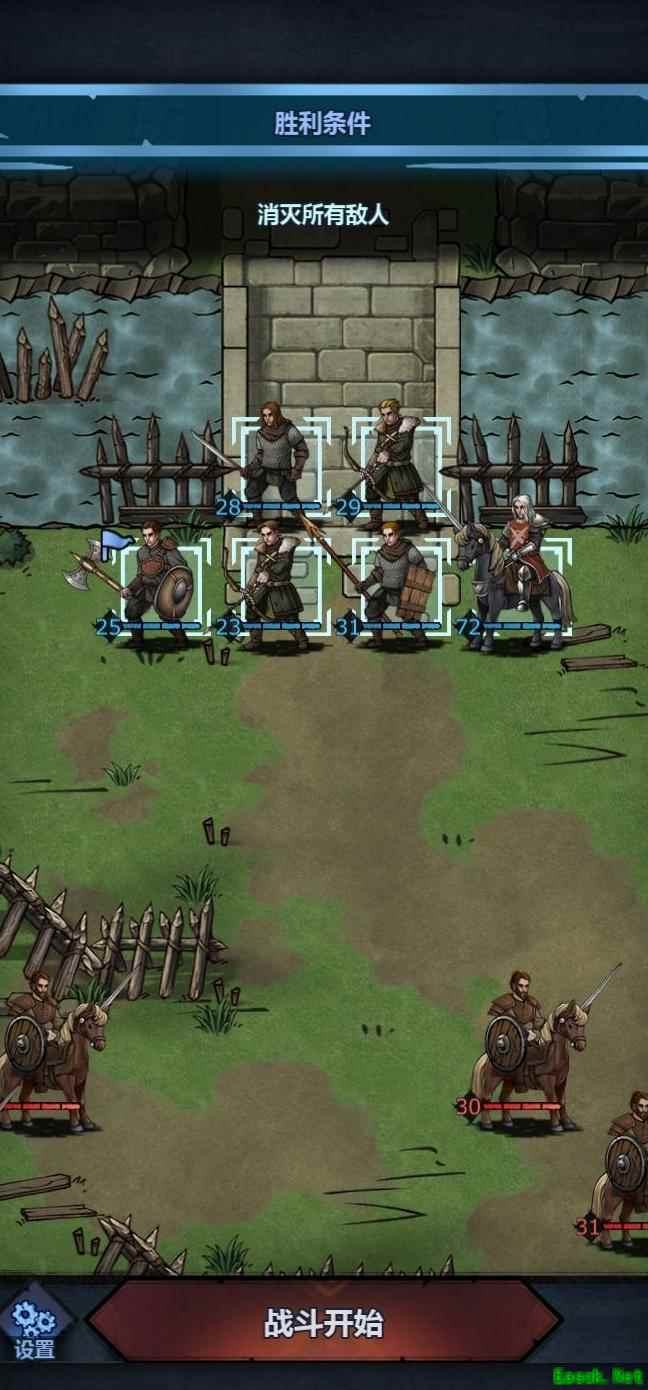 主角与丹尼尔从左上方推进,两名弓箭手灵活配合,艾丹留守左侧防敌突袭,老骑士则向下发起进攻,整体阵型协调有序。