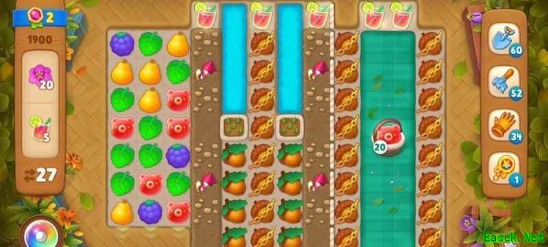 开局先观察,本关共27步,目标是收集粉色小花和柠檬水。