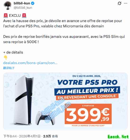 今日,据靠谱舅舅党billbil_kun爆料,在索尼近期宣布PS5系列主机涨价的背景下,法国游戏零售商Micromania于4月2日推出了一项极具吸引力的以旧换新活动:消费者购买PS5 Pro时,可用旧款主机折抵高额费用,其中PS5 Slim最高可折抵500欧元(约合人民币3900元),创下该平台折抵价历史新高。