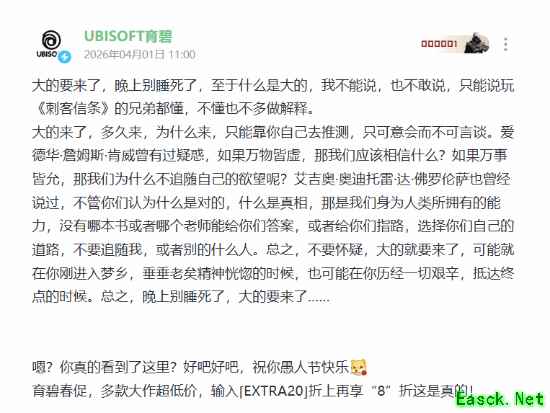 育碧发文:“大的要来了,晚上别睡死了……玩《刺客信条》的兄弟都懂。”然而,所谓的“大的”并不是新作发布,而是育碧春季促销的福利:多款大作超低价,输入优惠码【EXTRA20】还能再打8折。