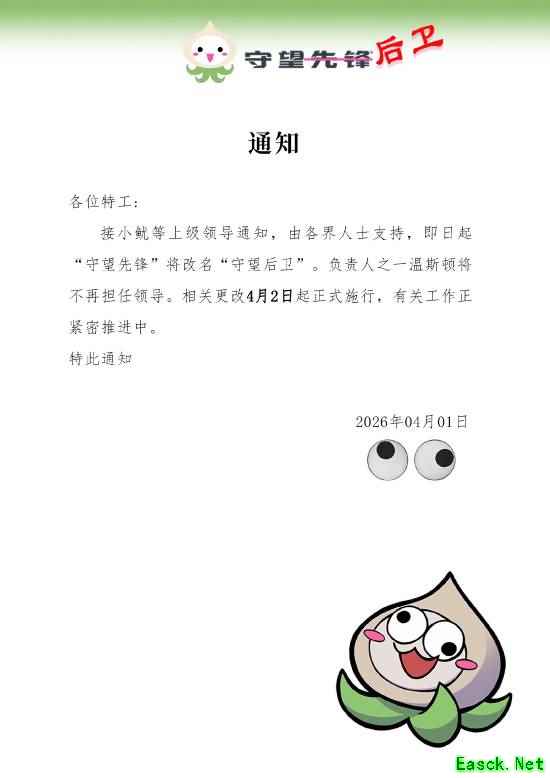 接小鱿等上级领导通知,由各界人士支持,即日起“守望先锋”将改名“守望后卫”。负责人之一温斯顿将不再担任领导。相关更改4月2日起正式施行,有关工作正紧密推进中。