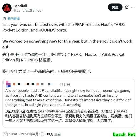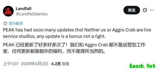一位用户指责《PEAK》的开发周期“懒惰”,声称开发者本可以做得更多(原帖现已删除)。对此,Landfall公开反驳称,团队已经为《PEAK》推出了大量更新,并强调:“Landfall和Aggro Crab都不是长期运营型工作室。更新是奖励,不是权利。”
