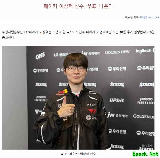电竞传奇!韩国将发行Faker纪念邮票:10月公布
