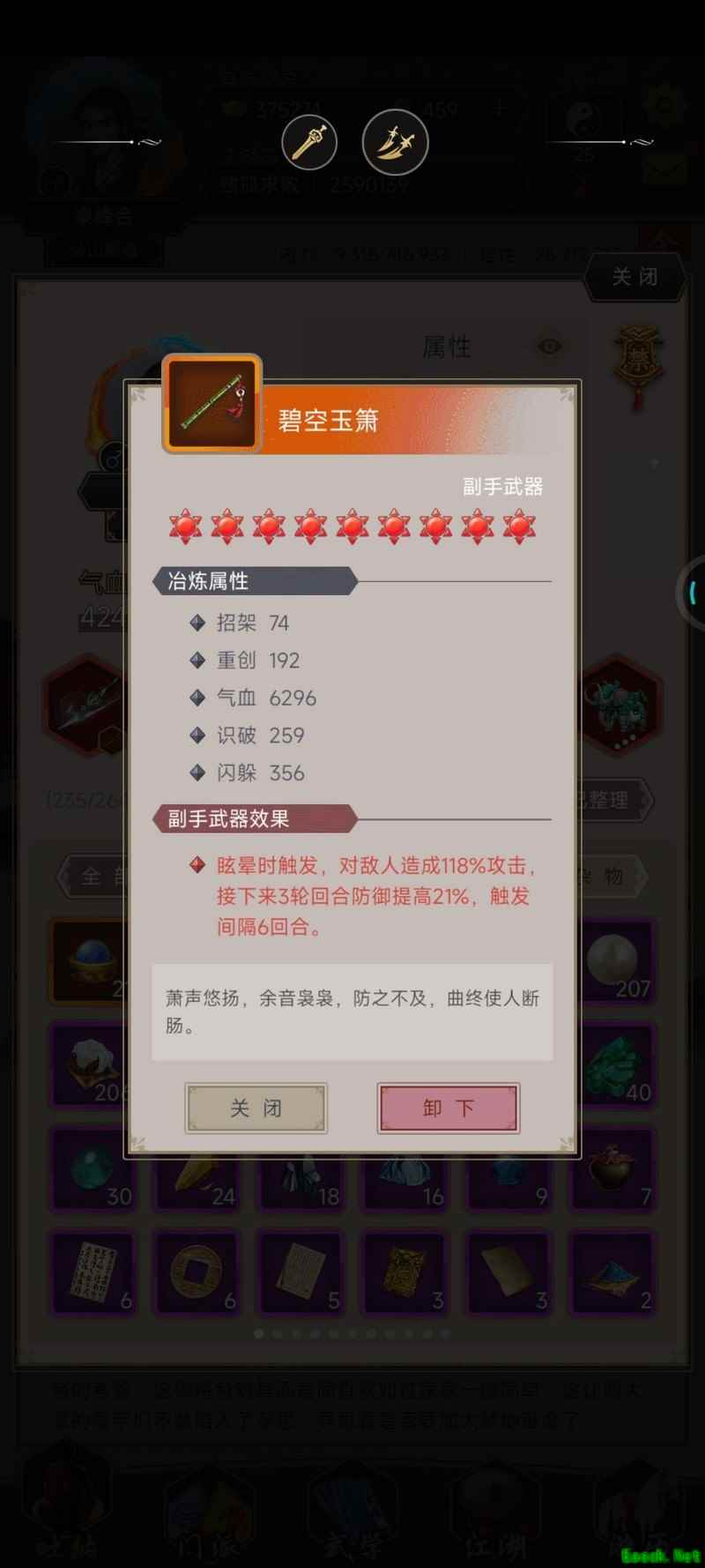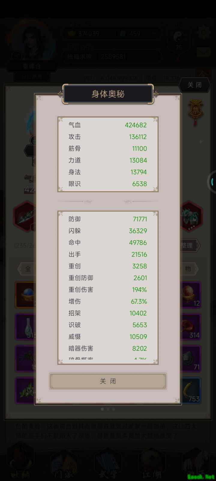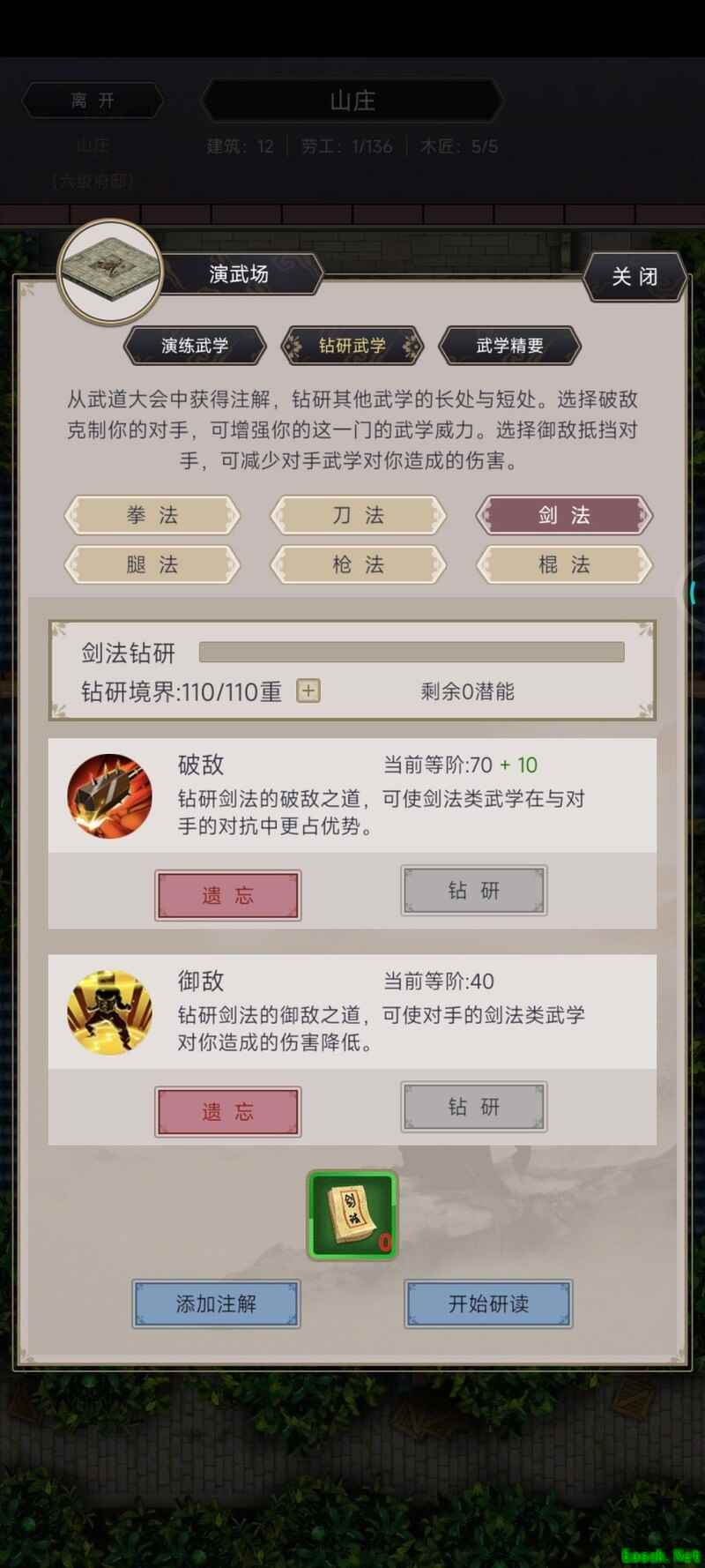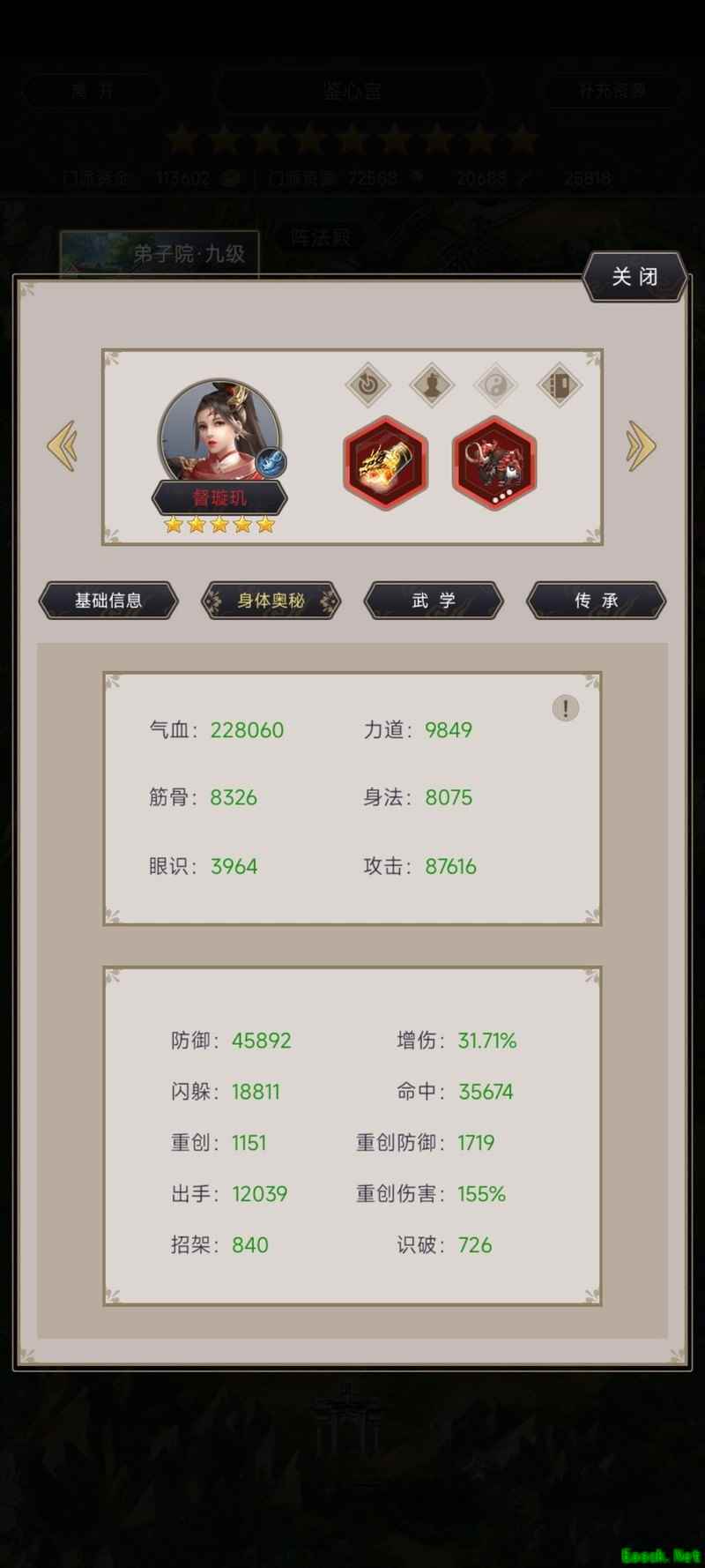最后一场boss战我用了外挂弟子,原本培养的棍法弟子没能派上用场,只带了腿法弟子出战。我的棍法弟子出招率达到了95%,可能是还没到100%的缘故。腿法弟子则是满级满阶,出招率和磨砺也都拉满,60点腿功破防与60点枪法防御,单挑胜利后还剩下大量血量,轻松击败了boss。其实棍法弟子除了出招率没满,其他条件都已具备,没能单挑成功还是有点遗憾。两个弟子都拥有橙色及以上品质的重防与破防天赋。