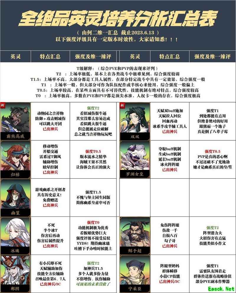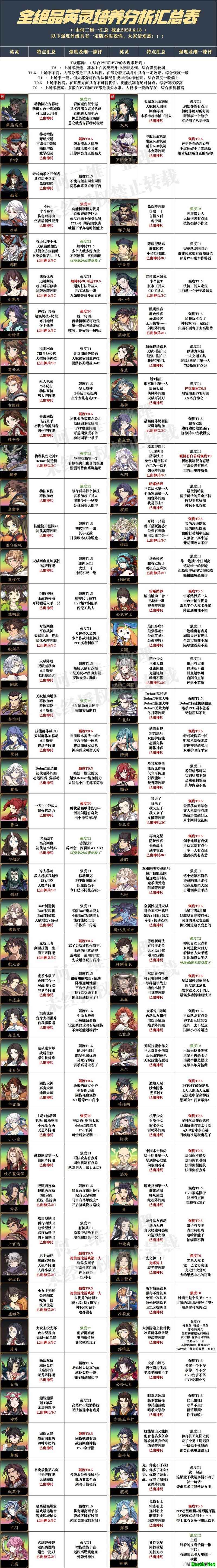 关于上图中的强度评级,其中个别角色的评价包含了笔者的一些主观看法。例如冰璃,虽然在不少玩家心中已难以胜任T0的定位,但笔者仍认为作为游戏的标志性角色,她在游戏中的地位和影响力依然不可忽视,毕竟大家对她的期待一直都在。不过,绝大多数角色的强度评级还是基于相对客观的原则进行评定的。需要说明的是,随着游戏中英灵数量不断增加,玩家们对各个角色的理解与使用方式也各具特色。因此,如果你对某些英灵的功能、评级或点评有不同的意见或建议,欢迎留言或私信交流。笔者会在后续版本中根据反馈情况适当进行调整。感谢大家的支持与理解。