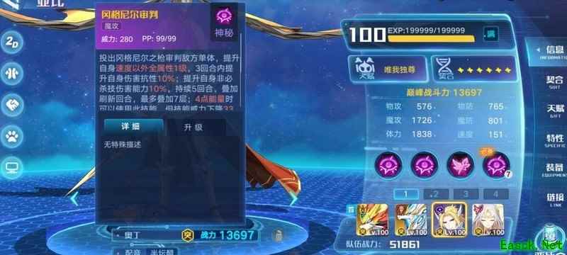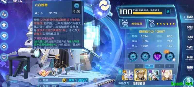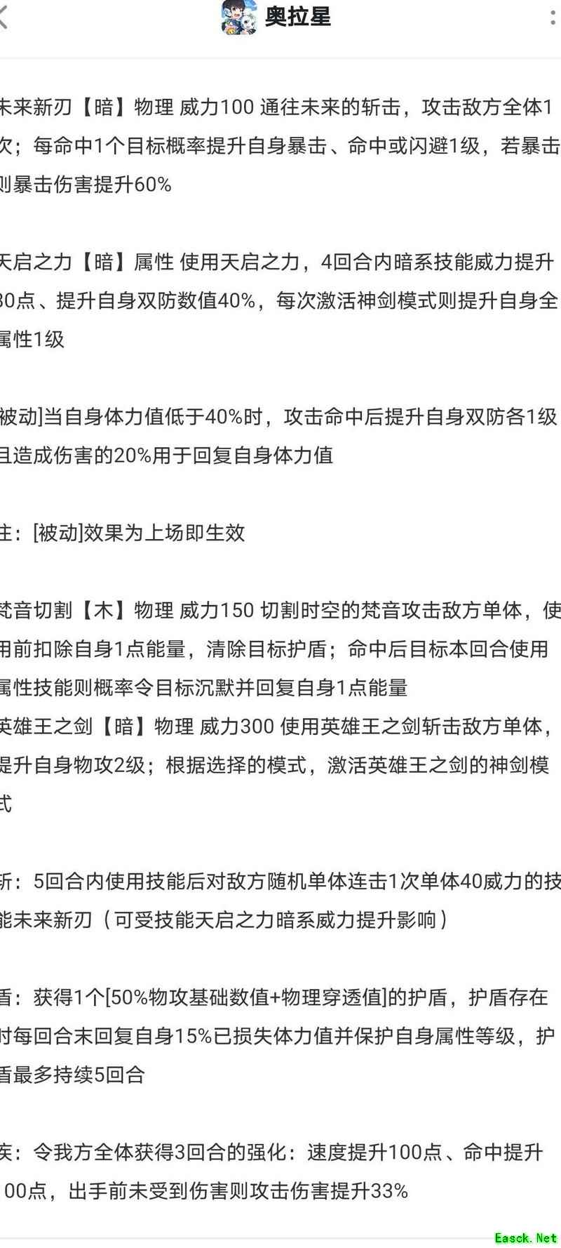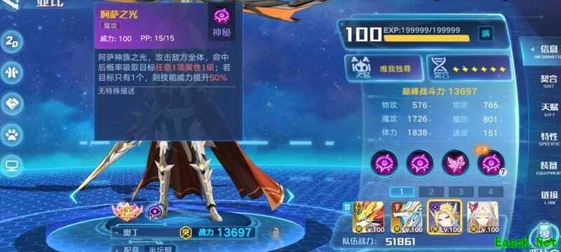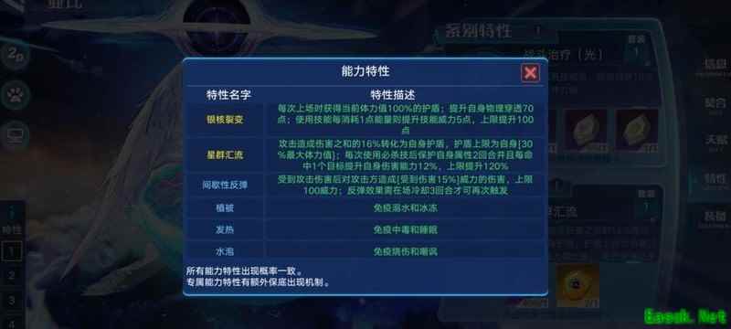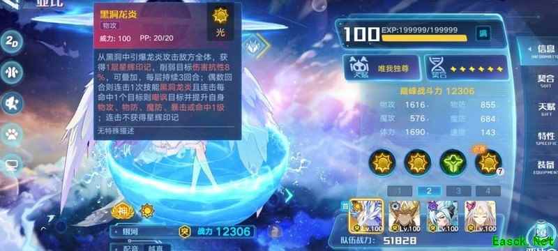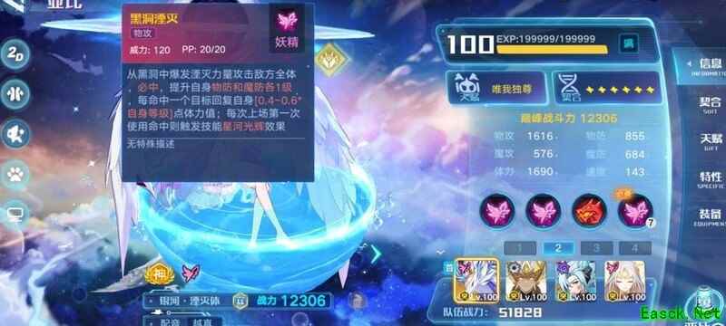 技能一黑洞湮灭具备必中特性,作用于全体目标,命中后提升双防等级,并对每个命中目标回复40至60点体力,首次上场使用时还可触发星河光辉,整体效果十分出色。