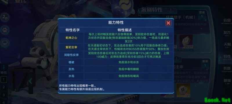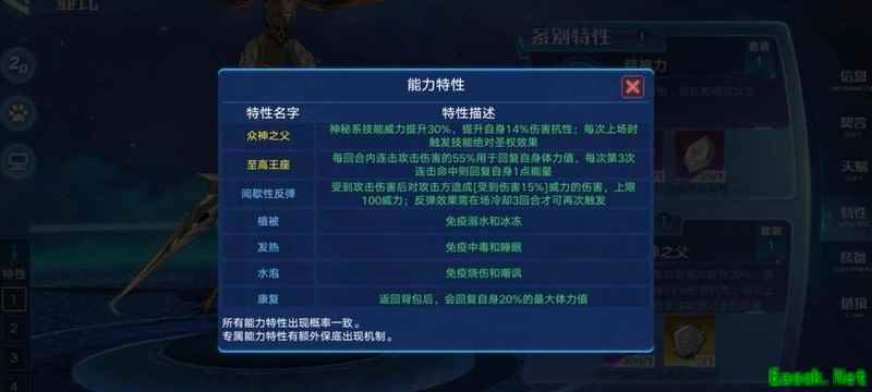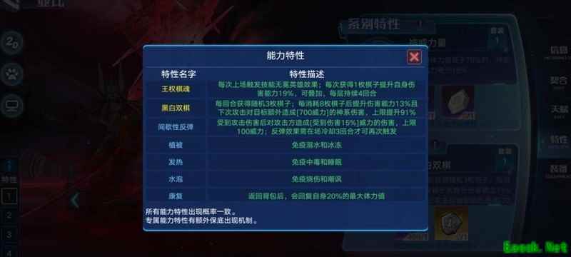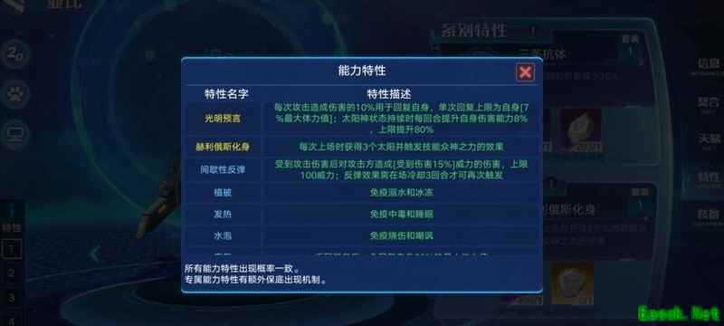 闪电王谕与雷电王谕虽为两个不同特性,实际效果却相似,均为回合结束时概率触发麻痹。区别在于雷电王谕提供60%增伤,而闪电王谕仅为40%。该机制最初用于开服诱导玩家消耗特性石,彼时保底仅限金色品质,如今已调整为可自选。