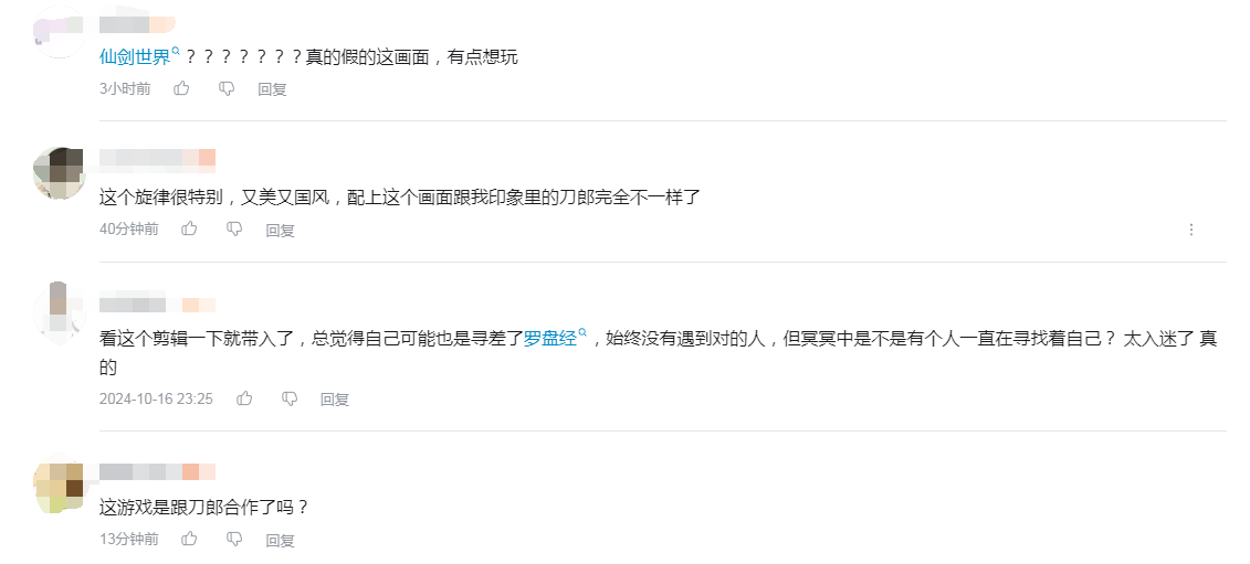 首先画面上,《仙剑世界》本来采用的就是最纯正的国风美术风格。从视频中就能看到,一山一水一花一木都栩栩如生,人物建模和发型服饰,更是将古风之美演绎到极致。这样精美的国风画面配上这首歌的故事,自然是相得益彰。难怪视频评论区里很多人觉得视频素材剪辑很配这首歌,还有人怀疑是不是刀郎和游戏正式合作了,因为实在是太搭了。