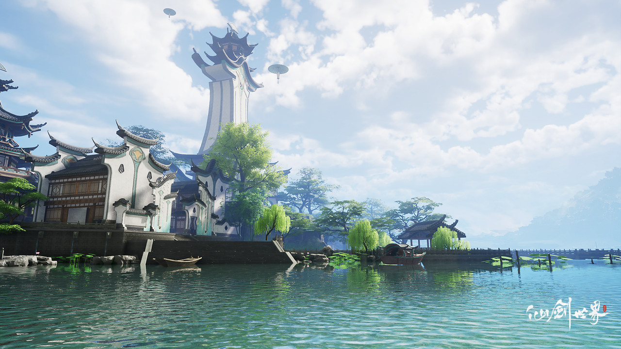 作为开放世界的首个大区域,“江南”本次也将以完整的形态呈现在玩家面前,除了更加丰富的内容体验,视觉上也将融合仙剑IP经典“三皇五灵”世界观进行全方位优化升级。在大家印象中,苏州和杭州作为江南最具有代表性的两座城市,苏州小桥流水,最适合踏春;杭州楼阁耸立,整个城市热闹繁华。而《仙剑世界》的苏杭则将三皇中的“女娲”相关元素融入其间——苏州岸边的杨柳缠着飘带,杭州高大的楼台围着天灯,在还原出原汁原味江南风情的同时,将仙剑美学运用到了极致,让玩家在亦真亦幻间感受东方浪漫幻想世界的意境之美。