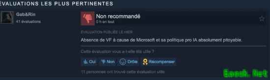 法国玩家的反应迅速而激烈。在Steam上,该DLC的法语区评分已跌至“非常负面”。评论区充斥着对“微软及其可悲的AI政策”的愤怒指控。