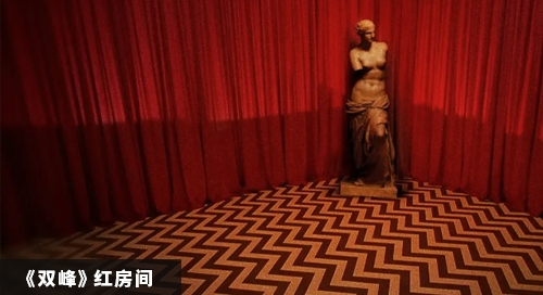 红丝绒质地的垂帘、黑白曲线纹路的地板以及密闭狭窄的空间……这些元素不禁让人想到《双峰》中的红房间。作为《双峰》中最具标志性的场景之一,“红房间”经常出现在主角库珀的梦境中,此处存在着各种举止怪异的人,不断向库珀暗示着与双峰镇案件相关的线索,这些错乱颠倒的现象恰恰是镇民们各种无意识的集合与具象化。