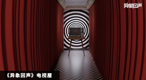 而《异象回声》中的电视屋也具有着相似的结构与设定,在视觉上,电视屋同样征用了红色的幕布式垂帘以及扭曲纹路的地板,基于核心要素延伸出涟漪式的黑白圆圈,这种处理方式将空间压抑感塑造地更为突出。在游戏序章剧情中,电视屋出现在“列王塔事件”的末尾处,代理科长本该被异象解码抹除,却在弥留之际被格蕾茜用封装体约束在这个叫做“灵泊”的地方。在此处,代理科长重新想起自己的身份,从而得以回归现实,从精神分析的角度来看,红房间与电视屋似乎都与集体无意识概念存在关联。