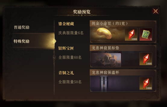 奖励内容相当丰厚如日芒石骰子、龙髓石和大师卷轴,也准备了具有收藏价值的精美周边。值得一提的是,在【涌金之地】服务器参与活动的旅者们,还将有机会获得更具吸引力的奖励。