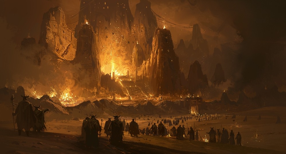 然而,天火之日的陨晶冲击使火龙陷入狂暴,拉玛兰山化为活火山。大河神达温倾力压制污染,自身亦遭侵蚀,最终封闭于精神领域隔绝混沌,换来火山沉寂与沙漠的脆弱和平,三大种族由此发展出自己的文明。
