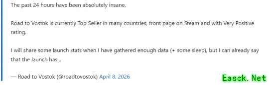 《沃斯托克之路》首发爆火 开发者兴奋表示今后开发预算充足