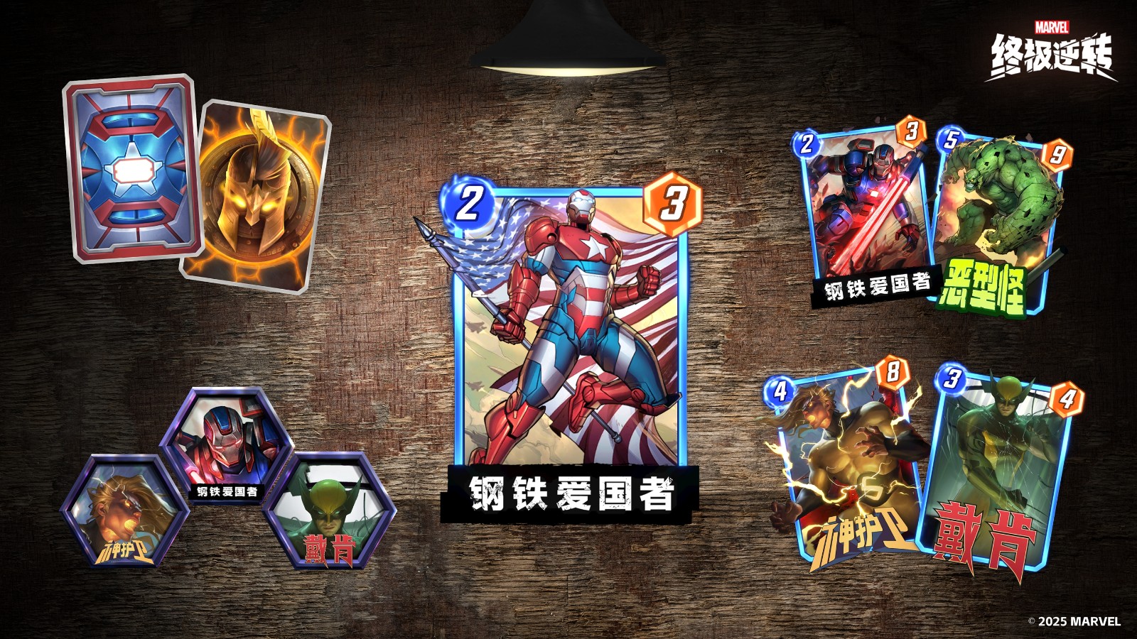 购买「黑暗复仇者」赛季通行证,就可以获得全新的角色「钢铁爱国者」。随着通行证等级的提升,还可以解锁全新变体、头像、卡背和其他资源。「钢铁爱国者」拥有强力技能:随机将一张能耗为4、5或6的卡牌添加到手牌,若是下回合「钢铁爱国者」所在区域领先则使抽到的卡牌能耗-4。集结!钢铁爱国者们!
