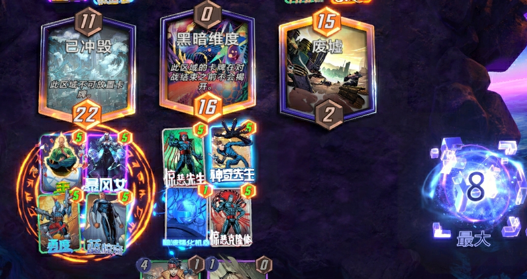 在对战部分,《漫威终极逆转》不仅保留了传统CCG的策略博弈乐趣,还创新性地融入了类似剪刀石头布规则的“共用回合制”和棋牌游戏的”超级加倍“系统。游戏的基础规则可以简单解释为“三区域比大小”,而在对局的过程中则充斥着各类“尔虞我诈”、“田忌赛马”的战术拉扯和策略博弈。上手门槛极低、策略上限极高、博弈刺激性极强是《漫威终极逆转》最核心的游戏乐趣。