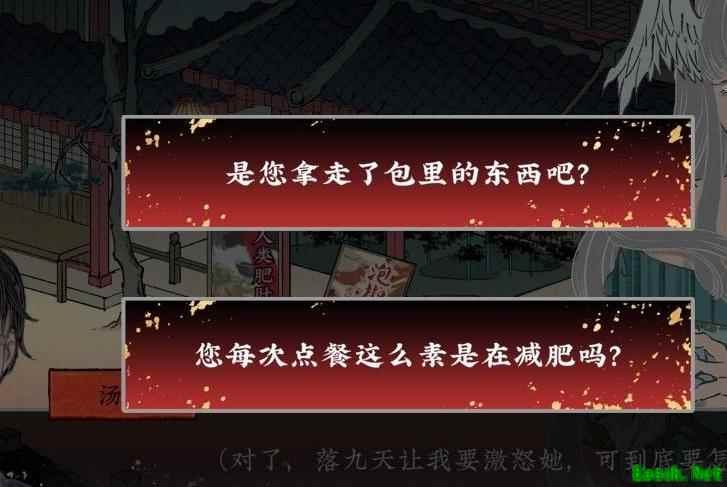 随后剧情会遭遇无常,在此提问时建议选第二项,而第二项中的第一个选项更佳(即是您拿走了包里的东西吧?),选择后将触发吞噬坏结局。