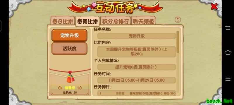 互动任务分为每日和每周两种类型,每日任务设有3项,于每日凌晨5点刷新;每周任务则有2项,每周一凌晨5点更新。玩家根据任务要求完成相应内容即可获得积分,积分获取数量与完成度排名相关,排名越高,获得的积分越多。任务设有完成上限,若多名玩家达到上限,则并列第一,共享最高积分,后续排名依次递减。整个互动任务周期为28天,包含1周的报名期和3周的比拼期,最终依据总积分排名发放奖励。在首次开启的互动任务中,多数玩家战力在10万以下,竞争相对较小,因此新手玩家可选择在此阶段参与并争取奖励,待获得优势后再逐步提升实力,否则等到后期竞争加剧,想要取得领先将更加困难。