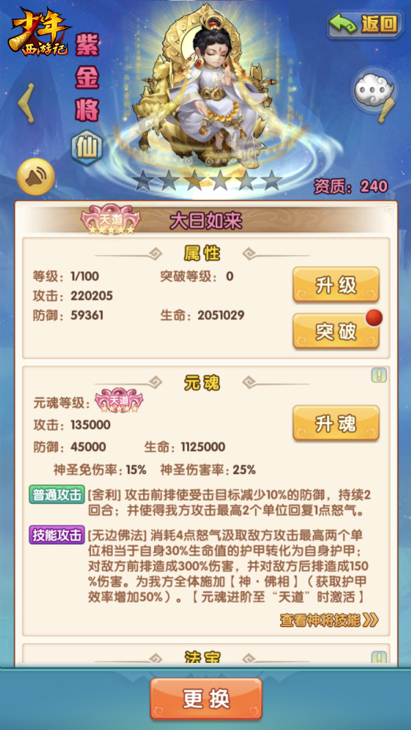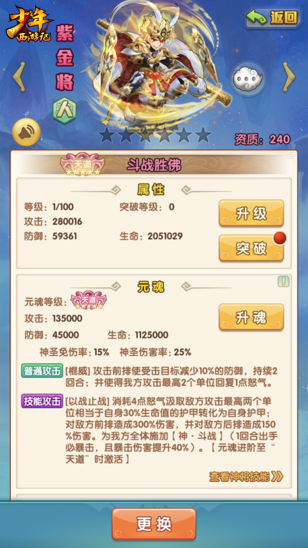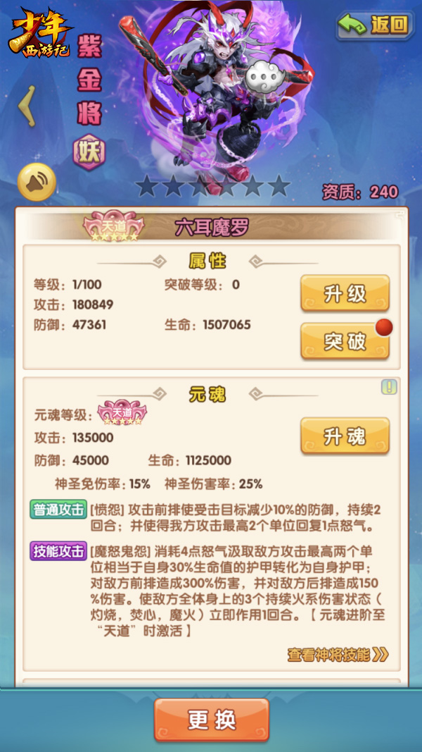 与之前的紫金神将不同,斗战胜佛、大日如来和六耳魔罗拥有特色代替出手机制。在战斗中达到条件后他们将分别开启“护·猴灵”、“护·佛佑”和“护·魔体”效果,这些效果不仅可以提升全体友方的伤免,更可以在特定条件下代替友方出手,释放无消耗的怒气技能,对敌方造成巨大的伤害。