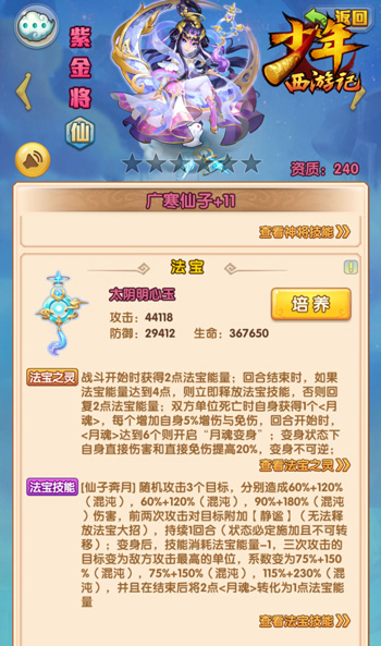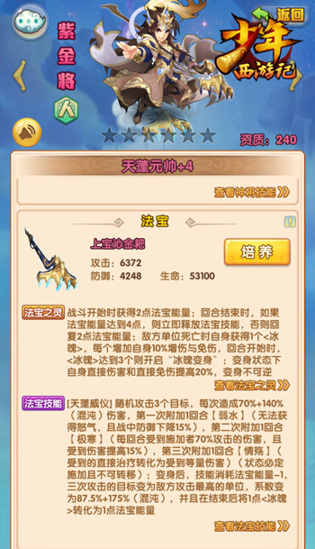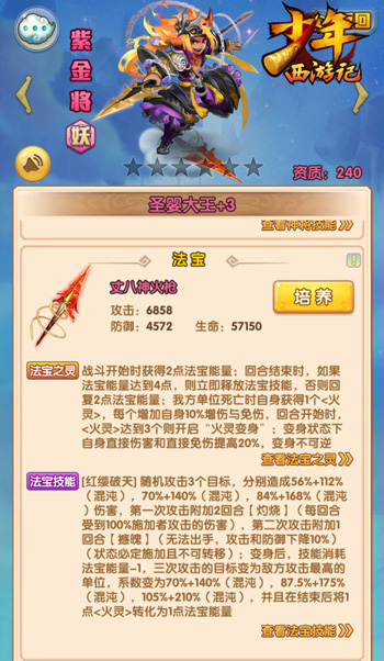 与此前紫金神将不同,天蓬元帅、广寒仙子和圣婴大王拥有特色变身大招。在战斗中,达到条件后他们将分别进行“冰魄”变身、“月魂”变身和“火灵”变身,变身后的紫金神将直接伤害和直接免伤将大幅提升,并且可释放更加强力的法宝大招,对敌方阵容造成巨大威胁。