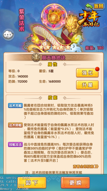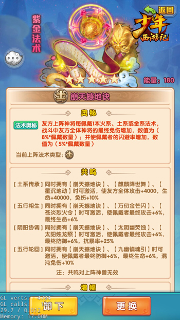 全新紫金法术“崩天撼地诀”可使佩戴者在回合结束时,吸取敌方攻击最高神将的攻击力并转化为自身的防御力,从而在削弱敌方主力神将攻击的同时,提升我方神将的存活能力,彼竭我盈,我方神将更容易占据主动。