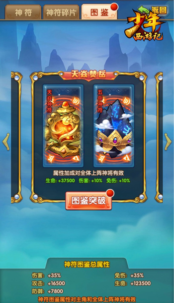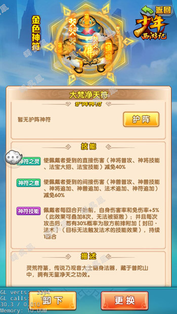 “大梵净天符”同样拥有强力的免伤效果,能为佩戴神将提供大量伤害减免,并且还可以在每回合开始前额外提升佩戴神将的伤害与免伤能力。同时,佩戴神将每次攻击后,该神符都有极大概率为敌方前排神将附加法术封印效果,极大限制了敌方的输出能力。