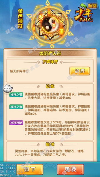与红色神符相比,“太阴遮天符”拥有更加强力的伤害减免效果,可极大降低佩戴神将战斗时所受到的直接伤害与间接伤害。此外,当佩戴者生命首次低于一定值时,它可为神将自身和除自身以外友方攻击最高的神将回复一定怒气,并恢复大量生命,从而保证了神将的续航与输出。