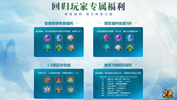 除了以上六大福利活动,回归玩家在“福利狂欢月”期间再战西游更有15天专属福利相赠,此外,还可上线参与1.6倍副本收益、3倍超值返利等专属优惠活动。