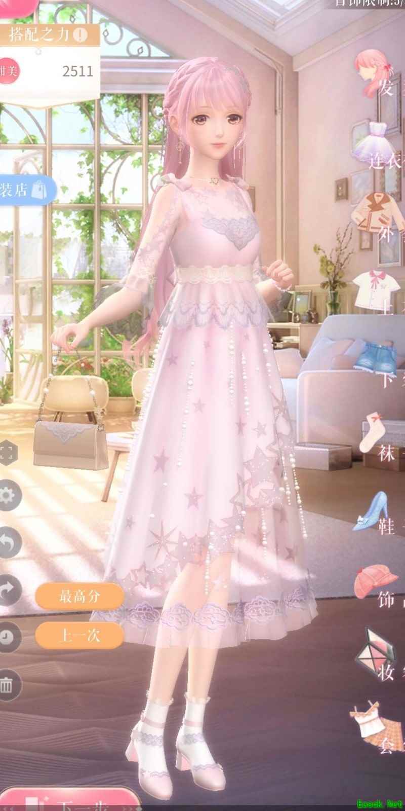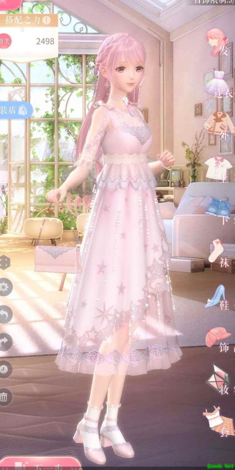 套装包含:初始赠送的抖落繁星、商店购买的粉心海贝、设计师之影升星获得的星殒,以及一见倾心项链。