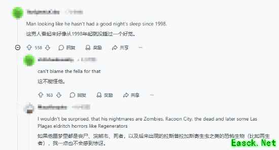 有玩家调侃,里昂看起来从1998年浣熊市事件后就没睡过安稳觉。这样的说法也得到很多人认同,毕竟他亲身经历过太多恐怖场面。浣熊市的丧尸与怪物、拉斯普拉加斯寄生虫带来的异形生物,都给他留下了很深的阴影。