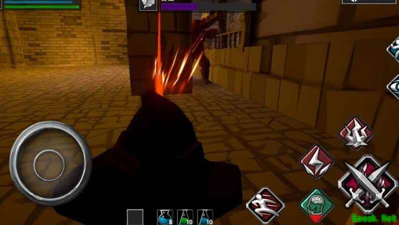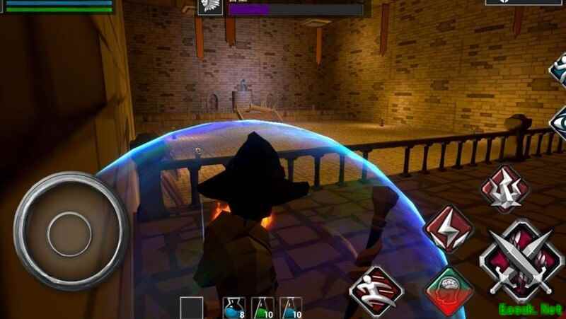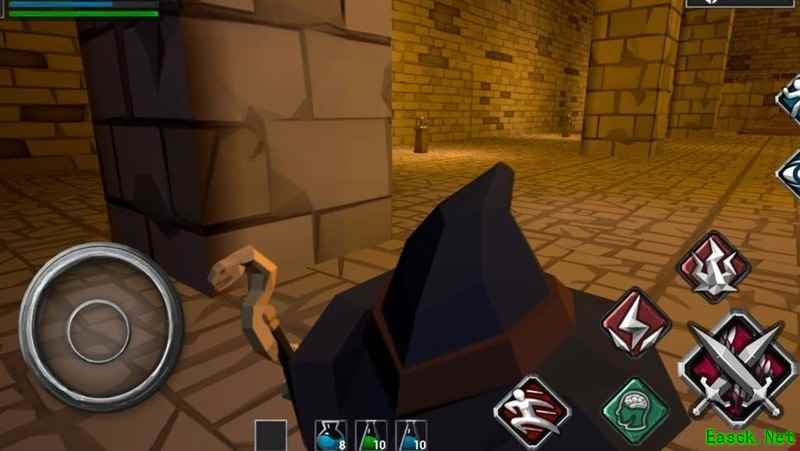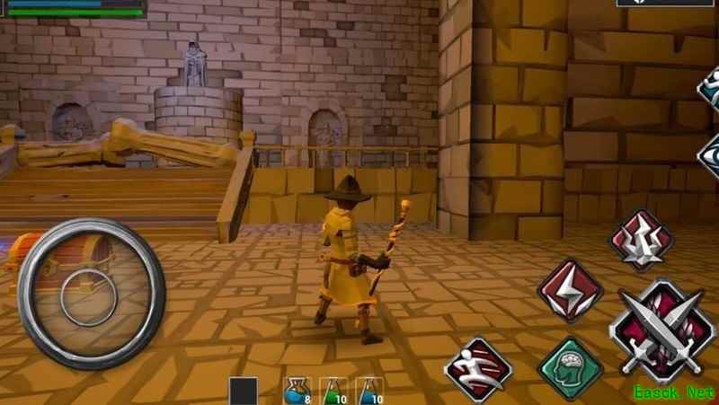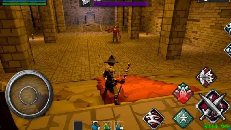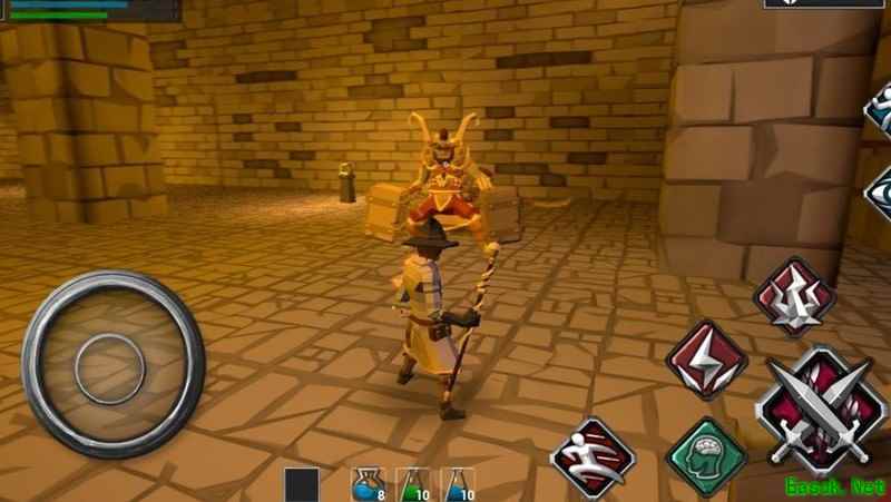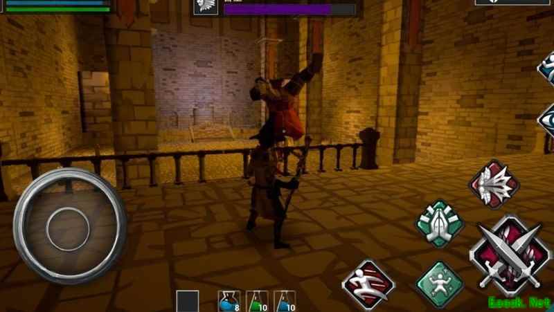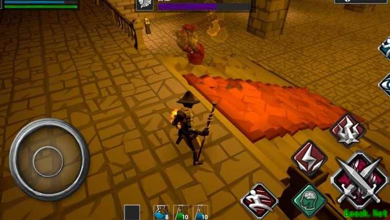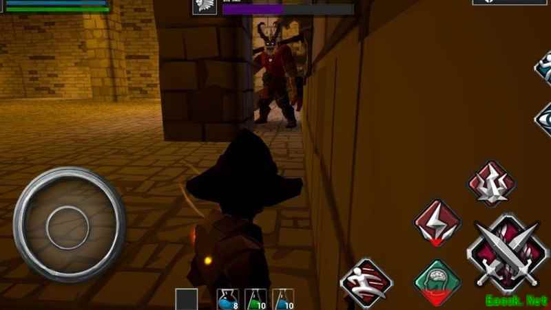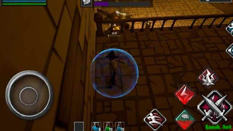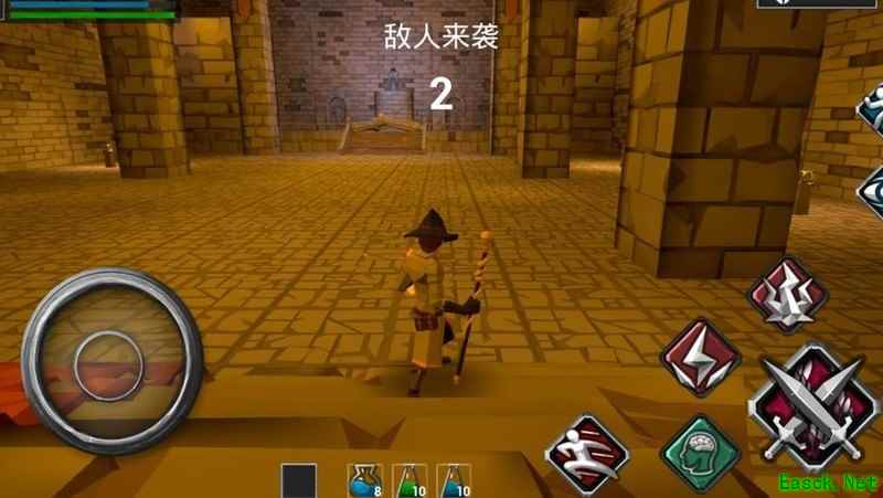 向左翻滚后迅速移动至柱子左侧,再翻滚到对面并锁定女巫师。用普通攻击打断其施法,使其暂时无法还击(注意保持距离,避免被火球击中)。随后边走位边输出。接着依次锁定持枪野蛮人、持斧野蛮人,最后集中攻击跳跳锤,逐个击破敌人。
