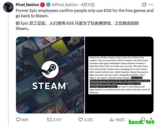 员工吐槽Epic商城沦为白嫖站 玩家领完就回Steam
