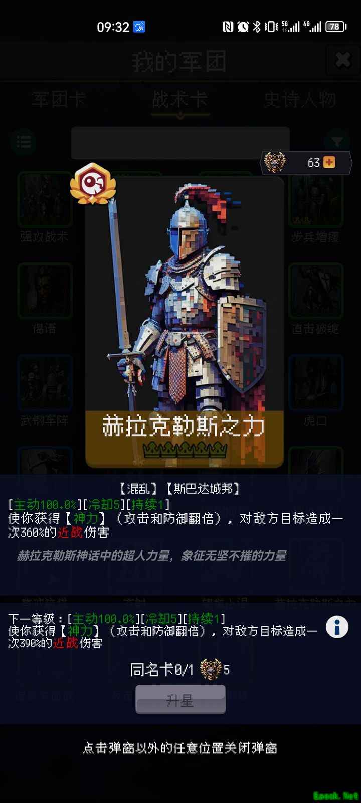 赫拉克勒斯之力购买斯巴达包后可在贸易站刷新,600钻石即可获取。这张卡性价比不高,升级意义不大,建议优先考虑升级秦铁骑,荣冠战争中够用即可,不如用钻石直接购买白起更划算。