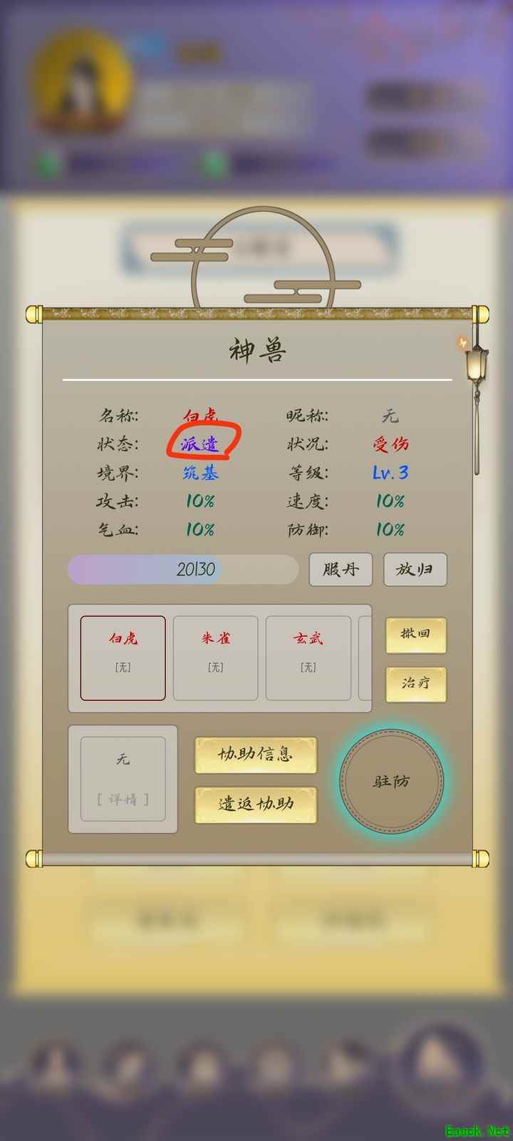 这里主要介绍神兽玩法,这一玩法独具特色,具有一定的互动性。玩家可以将神兽派遣给其他道友协助防守或战斗,具体的派遣信息可在图二红圈内的派遣字样处查看,能够看到将神兽派遣给了哪位玩家。