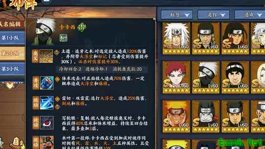 队伍配置:卡卡西居前,李紧随其后,勘九郎列第三,风主殿后。